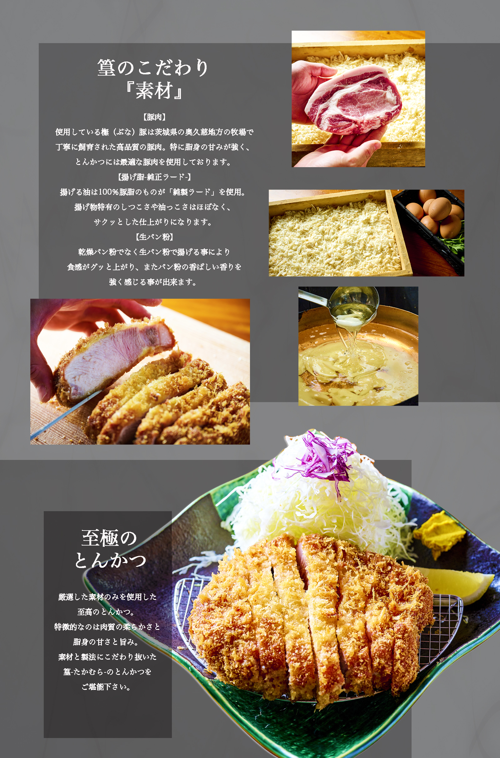 『豚肉』『パン粉』『揚げ脂』にこだわり抜いた至極のとんかつをご提供致します。
